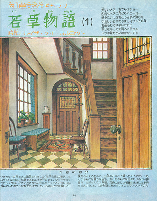 - これはもちろんあの有名なオルコット原作の「若草物語」のイラスト化です。くすんだ色使いと、少女達のしなやかな髪の流れに、子供の時読んで感じたくぐもった暖かい世界を鮮かに思い出します。『リリカ』に連載されました。(『増刊ぱふ』1986年vol.2より)